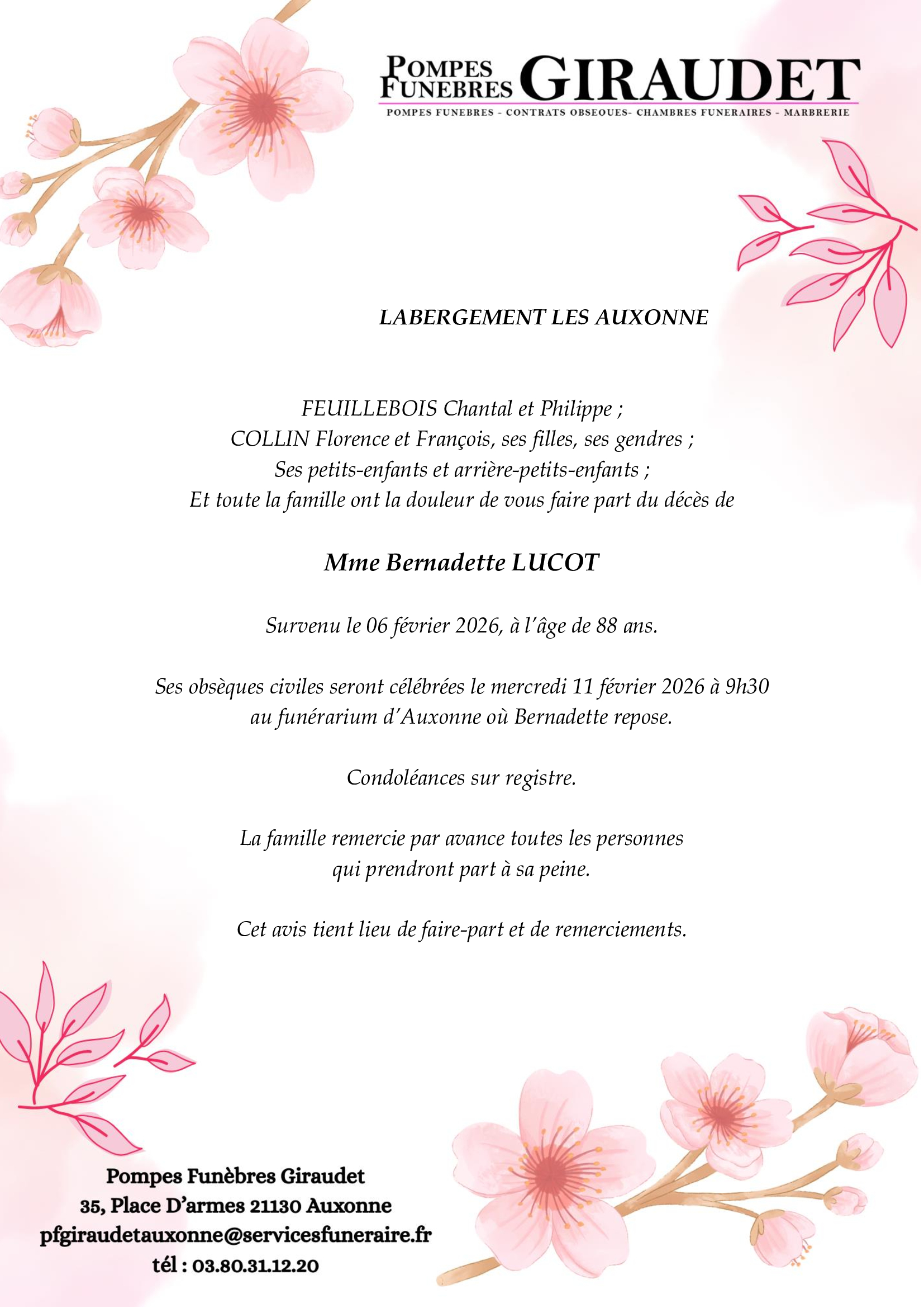 C’est avec une grande tristesse que nous vous annonçons le décès de Bernadette LUCOT survenu le vendredi 06 février 2026 à Auxonne. La cérémonie se déroulera le mercredi 11 février 2026 à 09h30 à l’adresse suivante : Funérarium d'Auxonne rue de Flammerans 21130 Auxonne