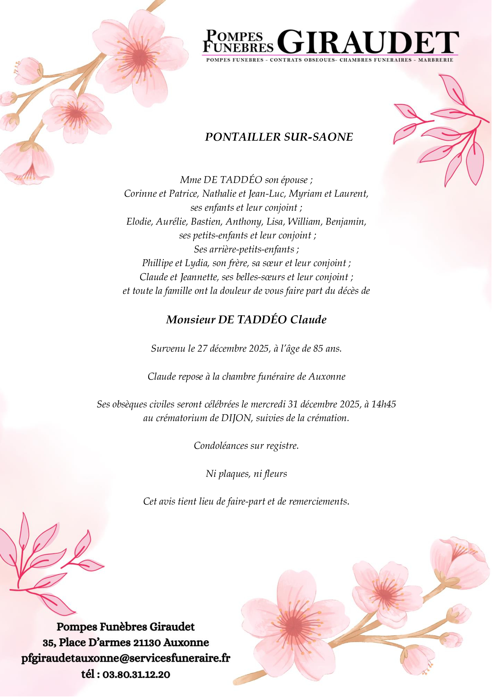 C’est avec une grande tristesse que nous vous annonçons le décès de Claude DE TADDÉO survenu le samedi 27 décembre 2025 à Dijon.