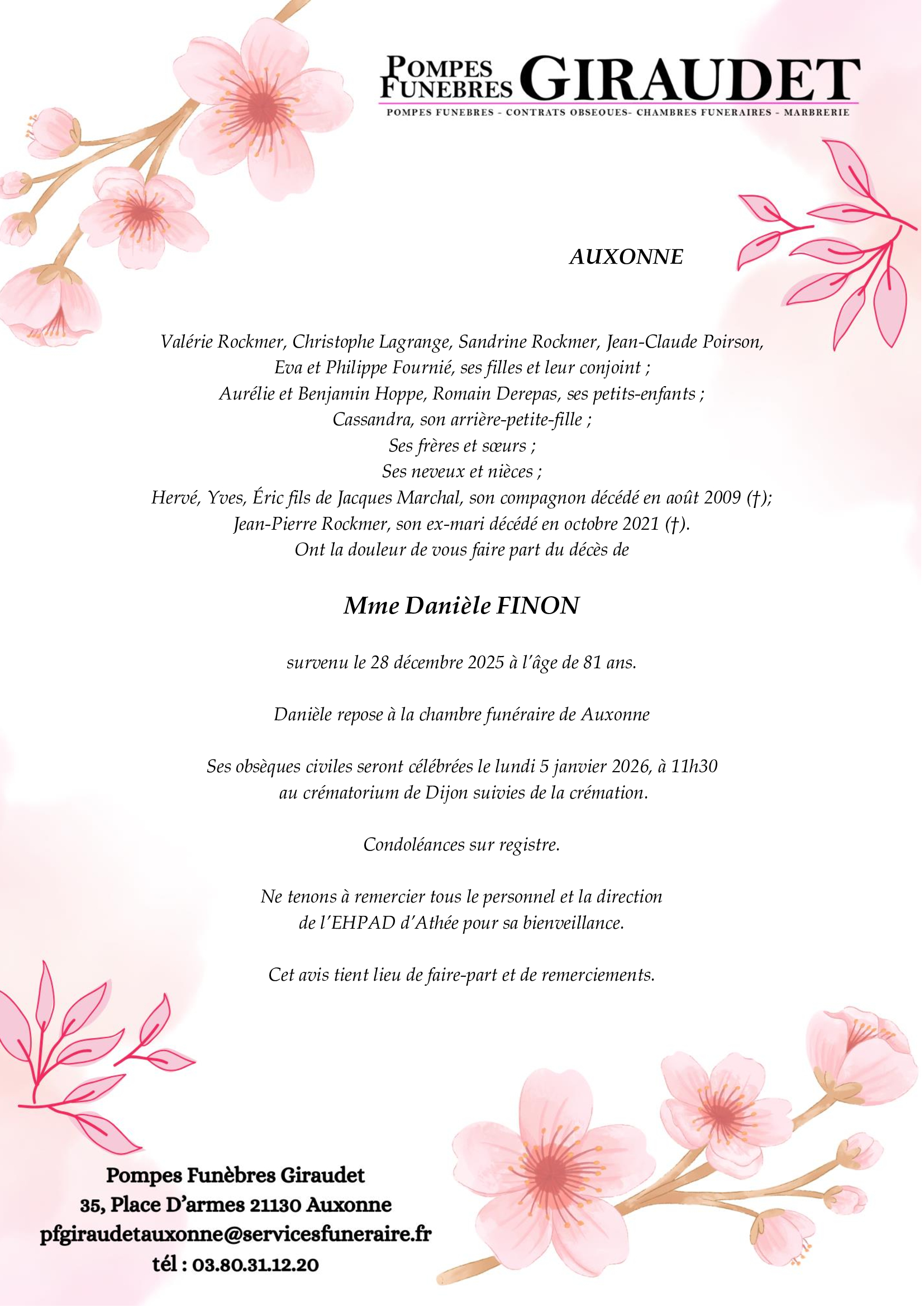 C’est avec une grande tristesse que nous vous annonçons le décès de Danièle FINON survenu le dimanche 28 décembre 2025 à Athée. La cérémonie se déroulera le lundi 05 janvier 2026 à 11h30 à l’adresse suivante : Auxonne Dijon - 21000 Dijon.
