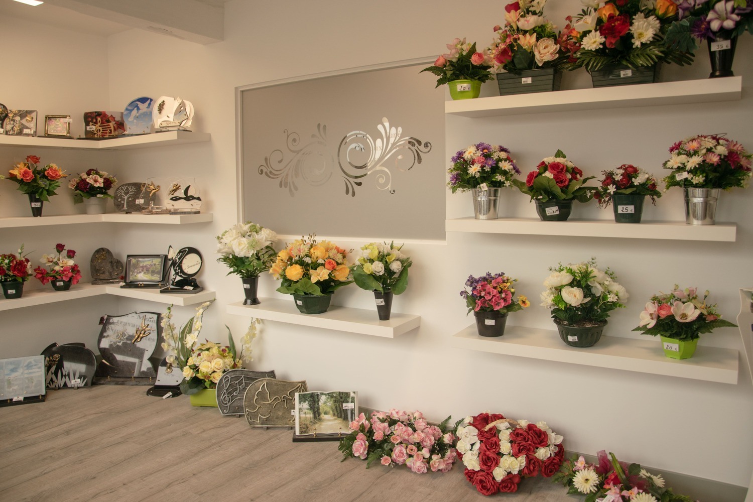 • – les articles : cercueil, capiton, urne, fleurs, plaques;